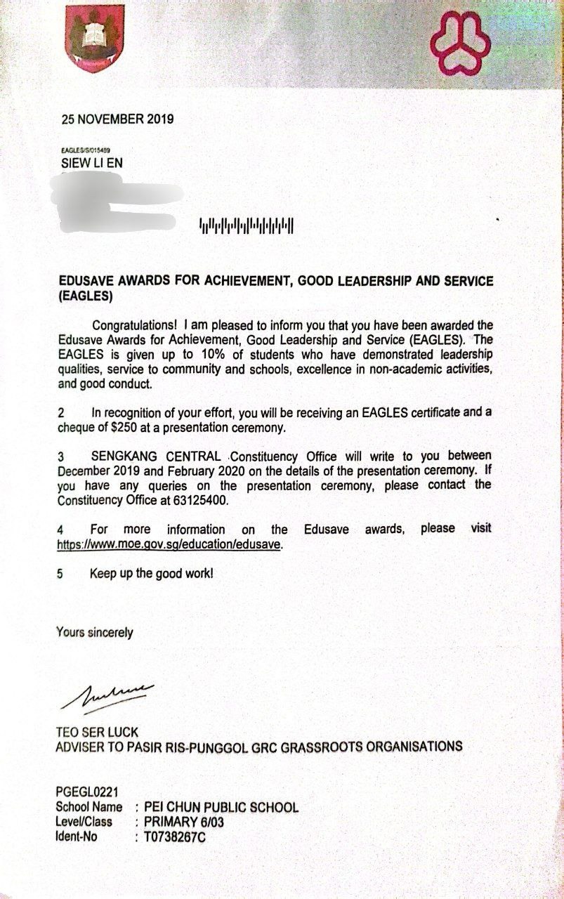 3rd December 2025 Received EAGLES award Edusave Awards for Achievement, Good Leadership and Service: given up to 10% of students.