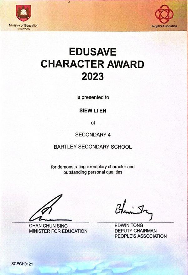3rd December 2025 Received the Edusave Character Award for demonstrating exemplary character and outstanding personal qualities.